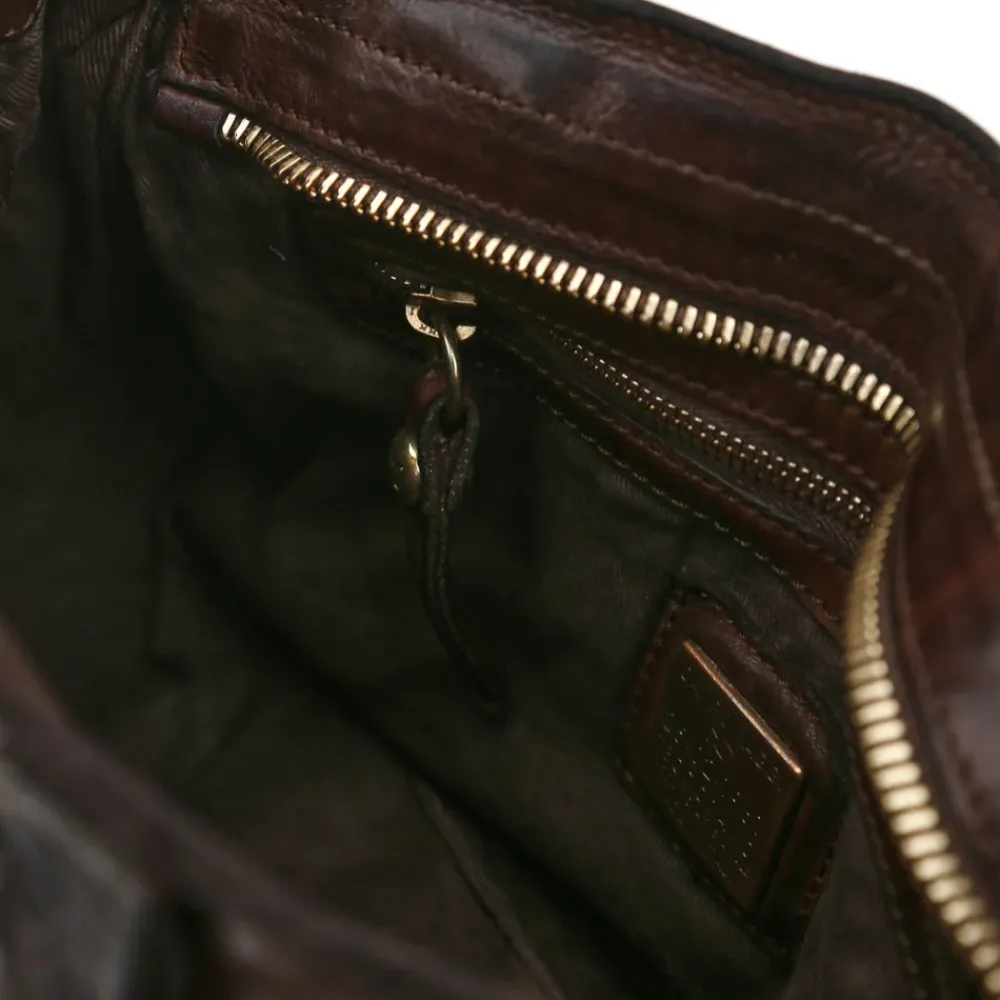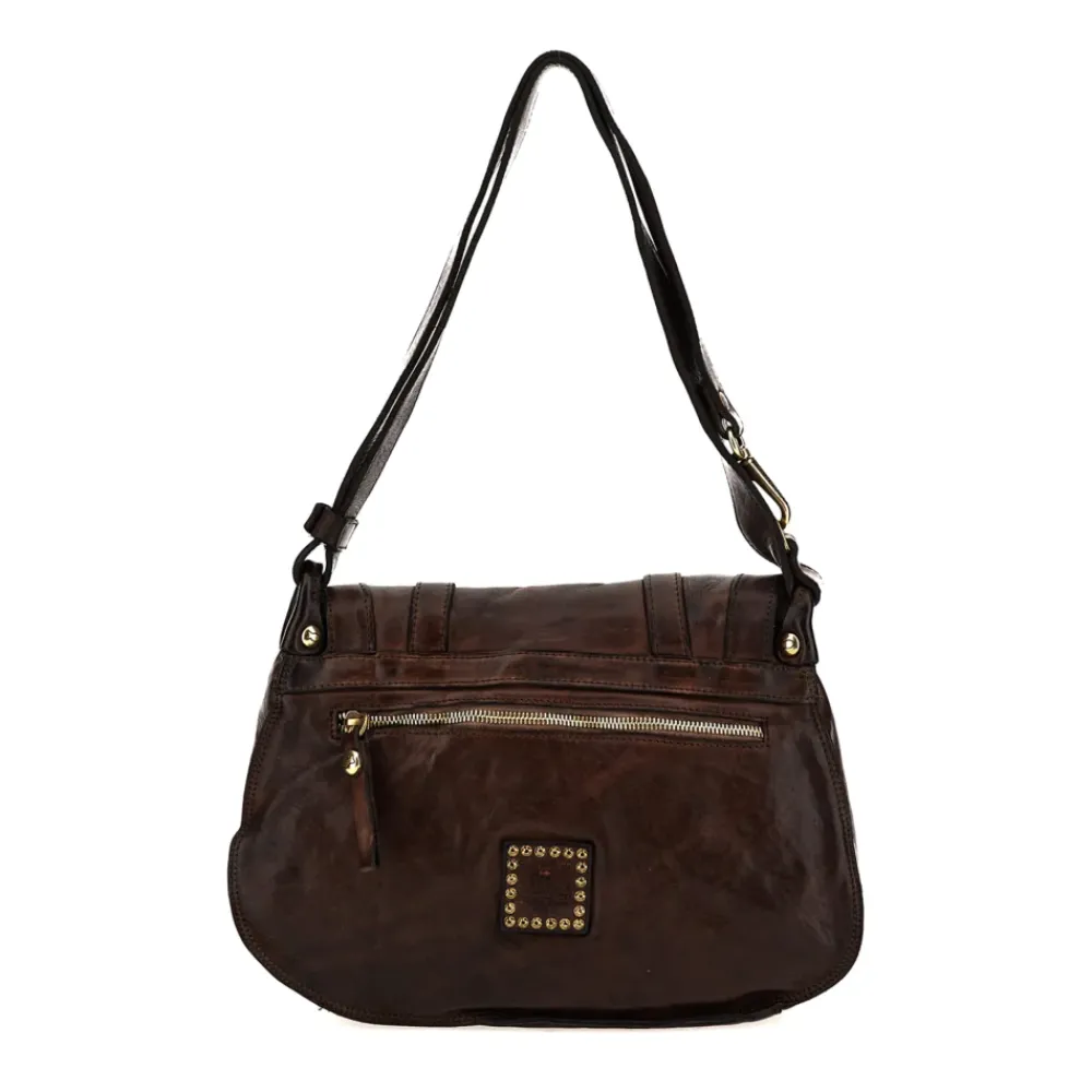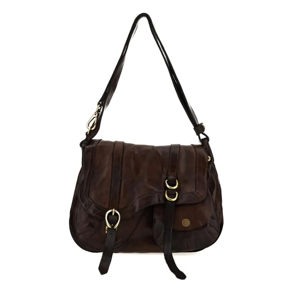 Stückgefärbtes natürliches Rindsleder, Innenfutter aus Baumwolle, Schnappverschluss, verstellbarer Schulterriemen aus Leder, Außentasche mit Reißverschluss hinten. Die Inspirationsquelle der Linie „Arya“ ist die Reitwelt. Der Überschlag jeder Tasche wurde mit einem System aus Schnitten und Nähten kreiert, das dem Design von Pferdesätteln nachempfunden ist. Das Design ist eine Anlehnung an eine vorherige Kollektion, die von der Campomaggi-Community sehr geschätzt wurde.