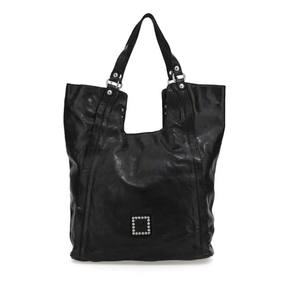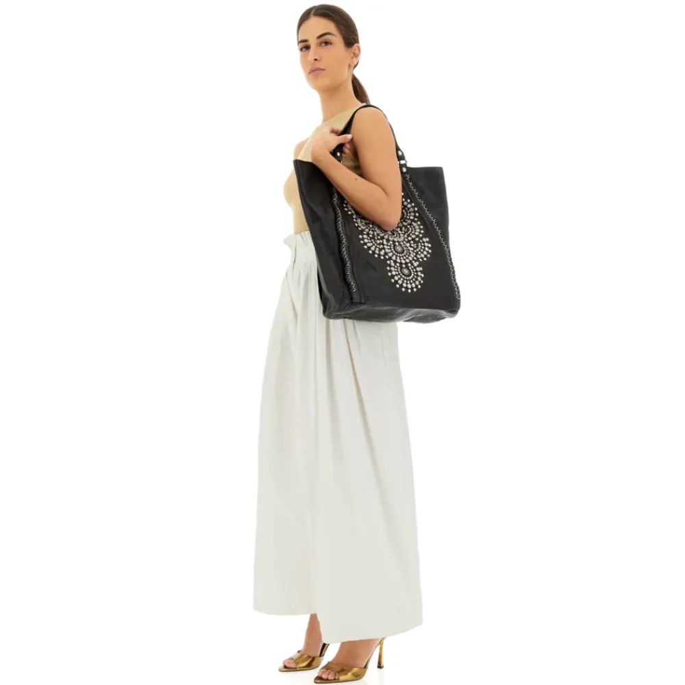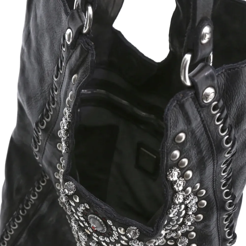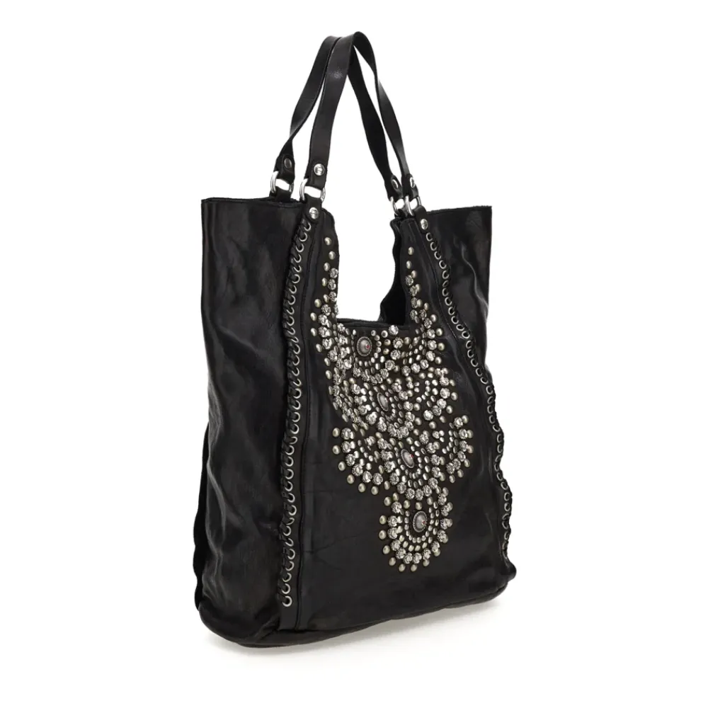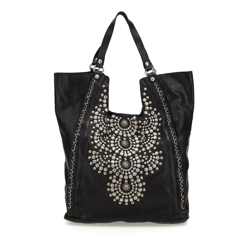 Shopper-Tasche aus schwarz gefärbtem Rindsleder mit Nieten „Camelia“