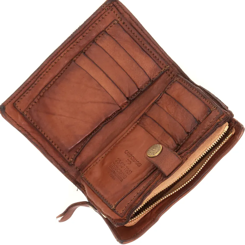 Geldbörse aus stückgefärbten natürlichen Rindsleder, Verschluss mit Lederarmband und Druckknopf, Kreditkartenfächer, mittlere Kleingeldtasche mit Clipverschluß