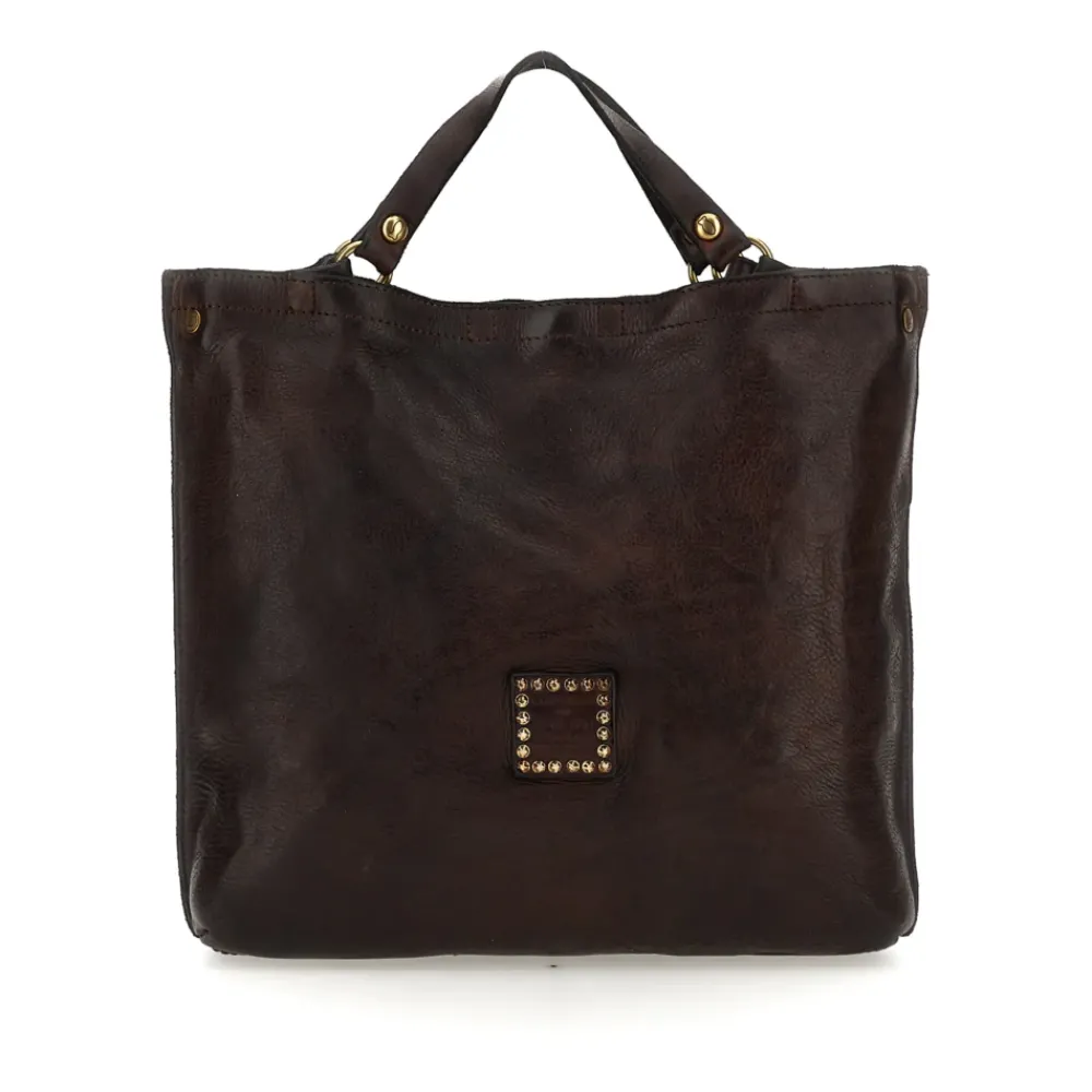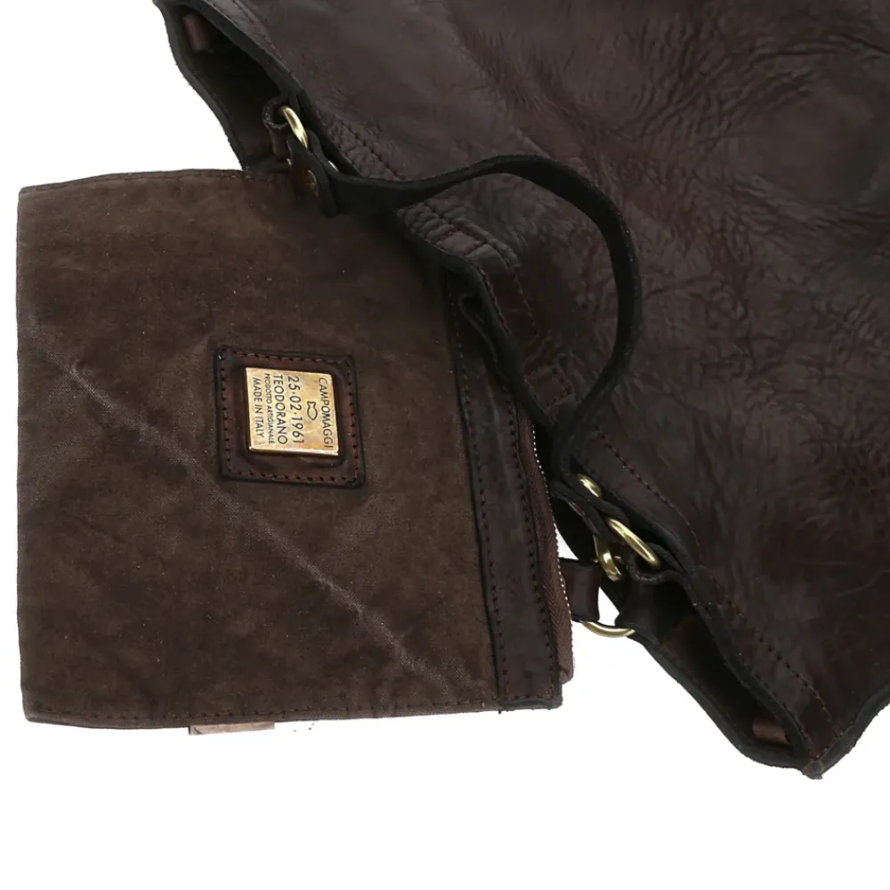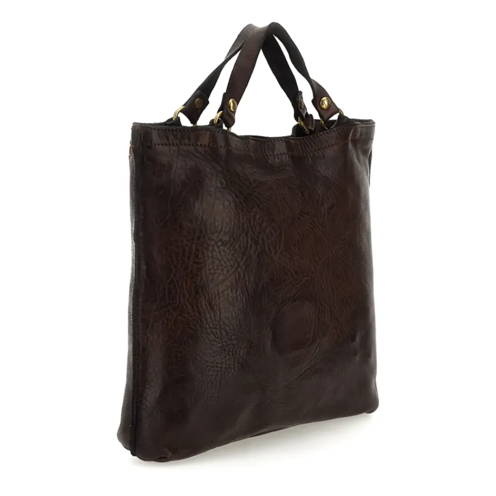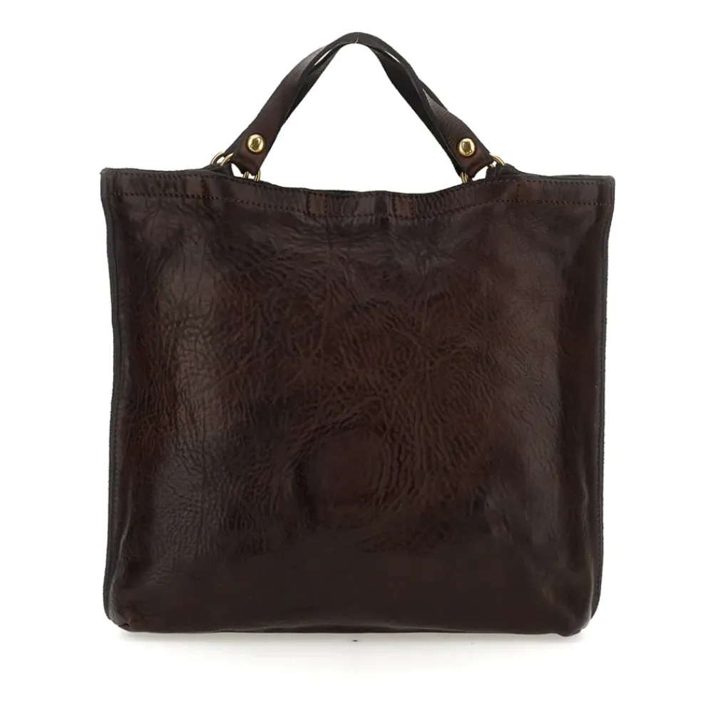 Ungefütterte Einkaufstasche mit Druckknopfverschluss und Kreuzriemen aus Band. Hergestellt aus natürlichem, durchgefärbtem Rindsleder. Inklusive Staubbeutel aus Baumwolle und Pflegecremeset. Made in Italy.