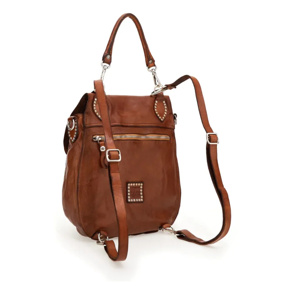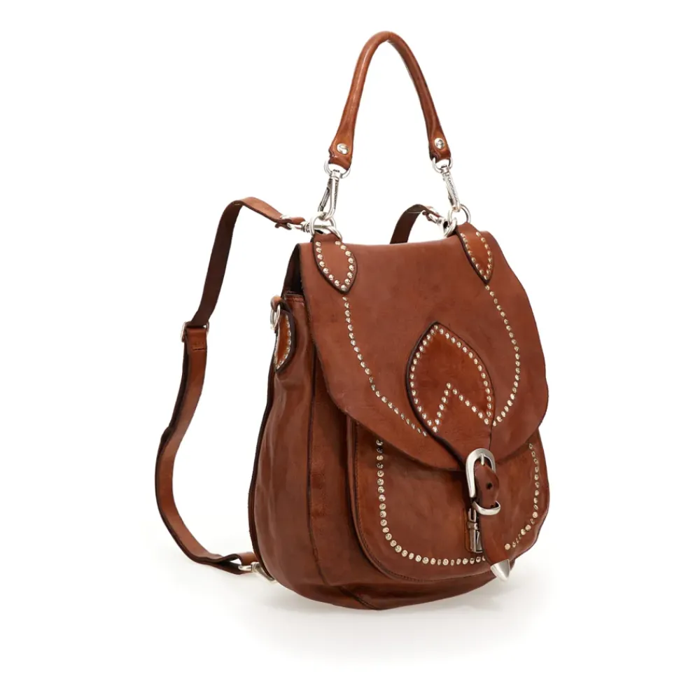 Umhängetasche, die sich dank der praktisch verstellbaren und abnehmbaren Schultergurte in einen Rucksack umwandeln lässt, gefüttertes Innenfach, Mappenschloss und Reißverschluss und einer Tasche mit Reißverschluss hinten. Die Linie „Texana“ besteht aus Modellen, die sich durch ein Nietenprofil am Überschlag und durch ein dekoratives tropfenförmiges Frontelement auszeichnen. Das repräsentativste Modell ist die Schultertasche, die auch als Sling-Rucksack getragen werden kann. Aus stückgefärbtem natürlichem Rindsleder mit Nieten. Mit Dust bag aus Baumwolle und Pflege Set bereitgestellt. Made in Italy.