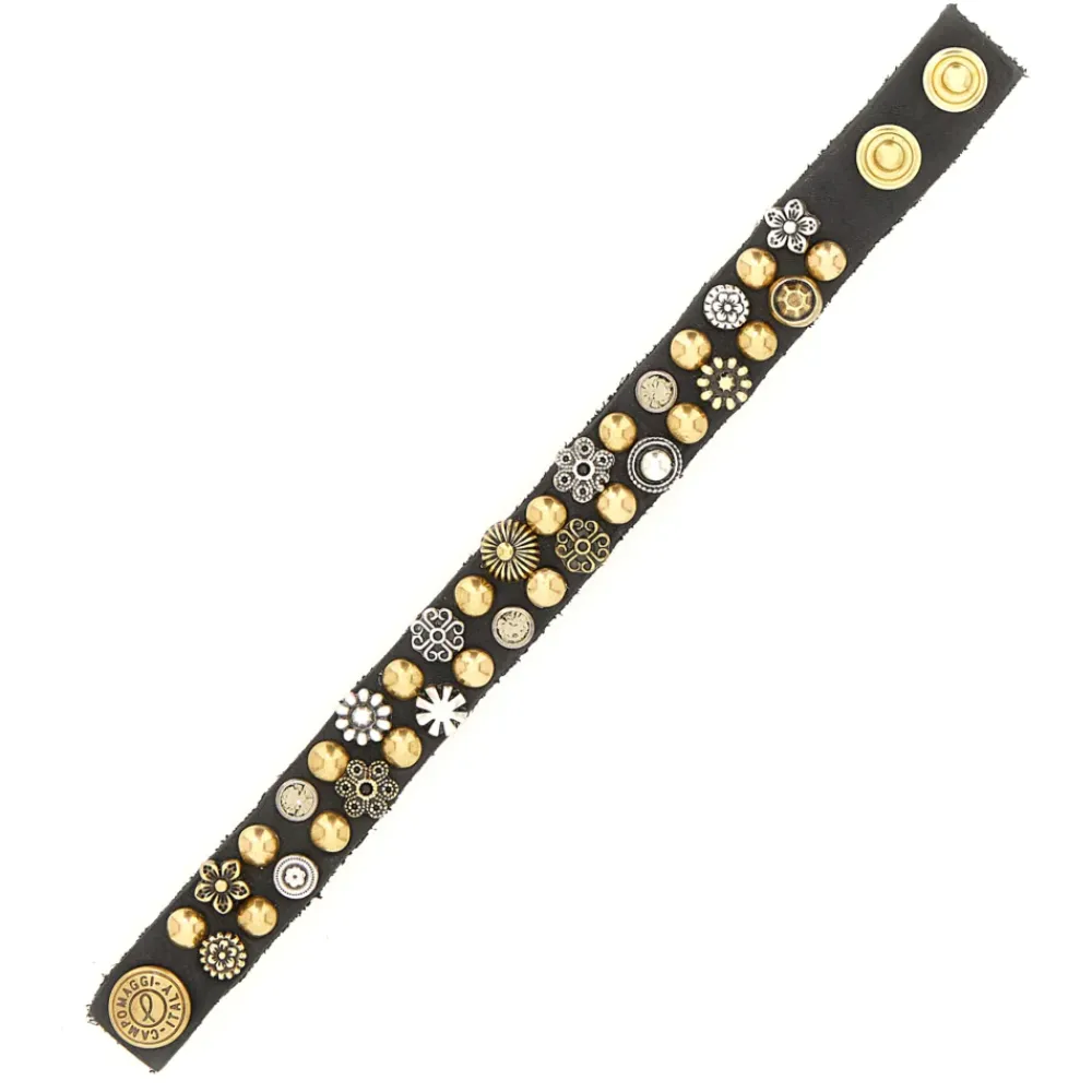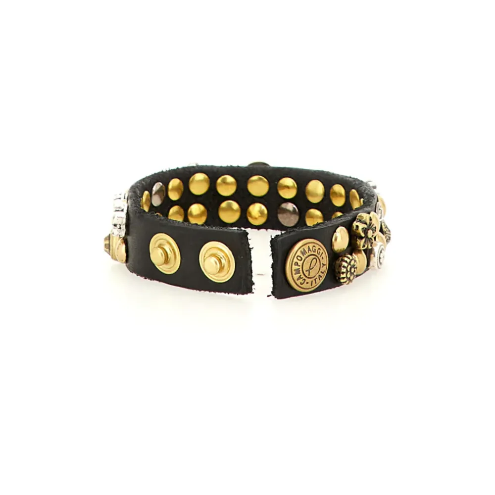 Die Linie „Kura“ zeichnet sich durch einen minimalistischen Stil in Kombination mit Verzierungen aus, die das charakteristischen Design von Campomaggi unterstreichen. • Armband • Aus natürlichem Rindsleder gefertigt, durchgefärbt und mit zahlreichen Schmucknieten besetzt