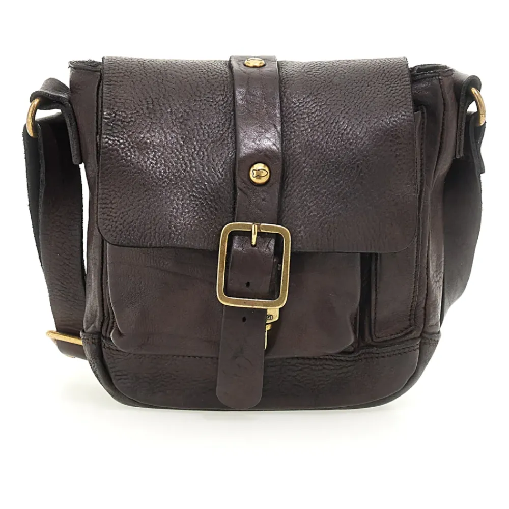 Kleine Umhängetasche aus stückgefärbten natürlichen Rindsleder, Klappe und Vordertasche, verstellbarer Schultergurt aus Leder, gefütterte Innentaschen offen und mit Reißverschluss