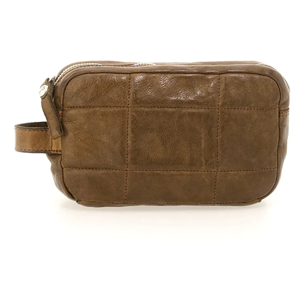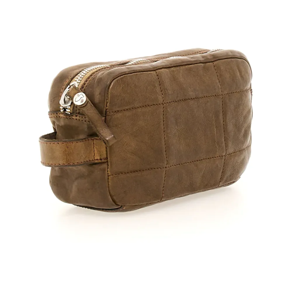 Gestepptes, militärgrünes Leder-Kosmetiktäschchen